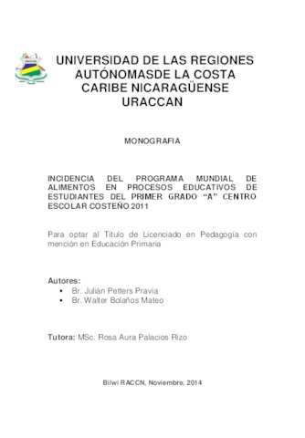 Petters Pravia, Julián and Bolaños Mateo, Walter (2014) Incidencia del programa muncial de alimentos en procesos educativos de estudiantes del primer grado "A" centro escolar costeño 2011. Diploma thesis, Universidad de las Regiones Autónomas de la Costa Caribe Nicaraguense (URACCAN)..